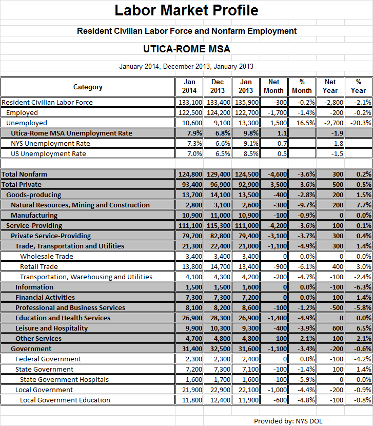 Labor Market Profile and Unemployment Data for the Mohawk Valley (Jan 2014)